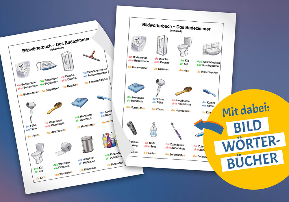 Dazu gibt es ein thematisch sortiertes Bilderwörterbuch und ein alphabetisch sortiertes Bilderwörterbuch.
